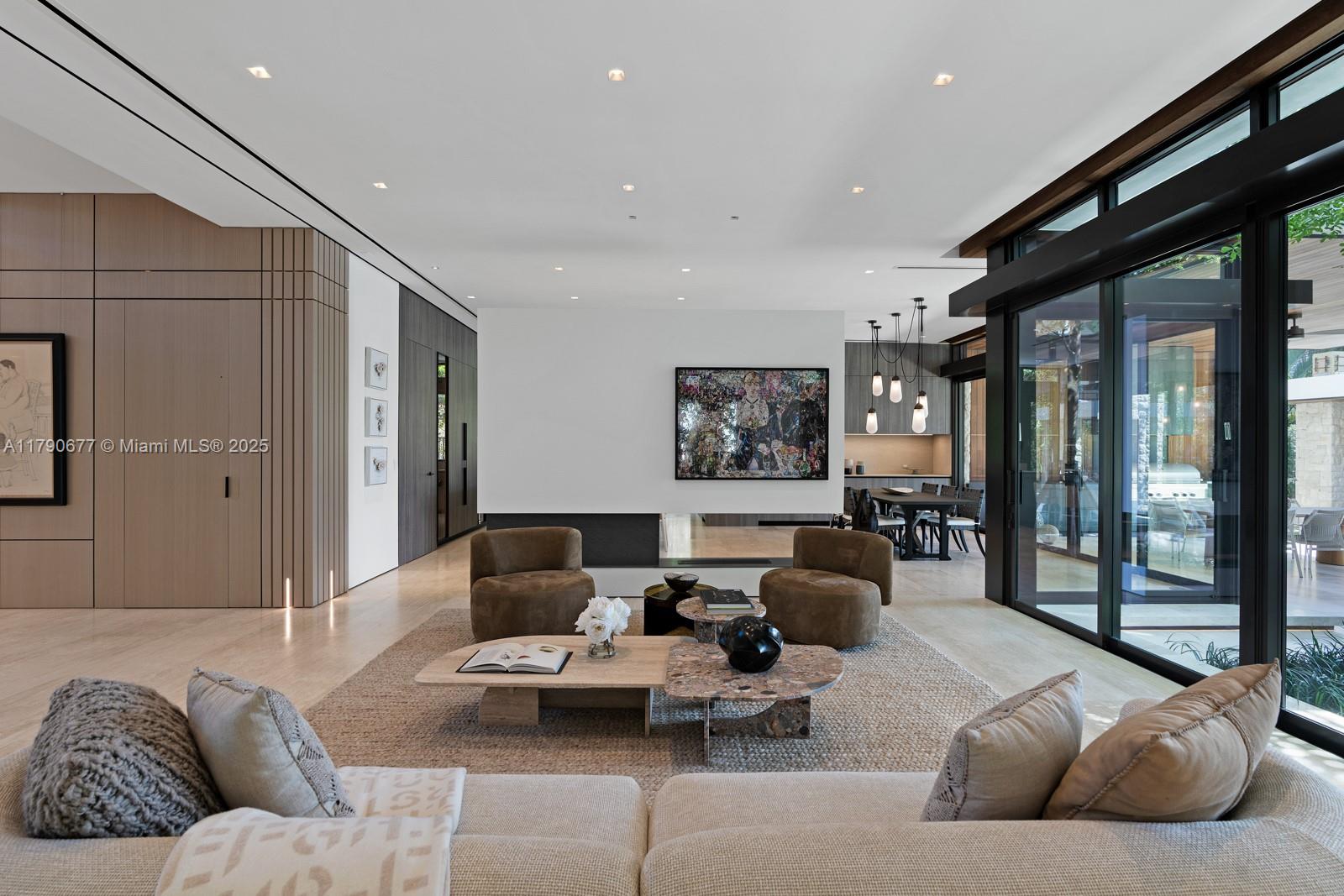 GOLDEN BEACH SEC D PB 10-10 LOT 26 & S35FT OF LOT 27 BLK J LOT SIZE 85.000 X 165 OR 13484-0661 1187 1 COC 21713-1922 09 2003 1 Glamour in Golden Beach! Masterfully designed, this 2025 residence sets a new benchmark in waterfront modernism. Hand-placed stone, iroko wood, and clear glass interlace a 100-year olive tree. The grand foyer achieves 24' heights highlighting Italian oak-paneled walls that lead to a sophisticated salon. Curated by Fanny Haim, the worldly interiors include a travertine bar in the bespoke media lounge, and stylized fireplaces & drapery throughout. The exceptional MiaCucina kitchen revolves around a bright breakfast area. An architectural staircase arrives to the primary suite’s dual dressing rooms and spacious marble bath enhanced by an upstairs library. A theater, office, gym, elevator & staff room complete the home. The resort pool shines with a cabana, Summer Kitchen, new dock + seawall.